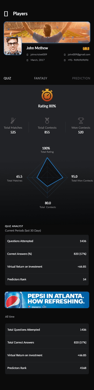 Key Screen Transformations: The home screen evolved from basic match listings to a personalized sports command center featuring user achievements and progress indicators. The profile screen became an achievement showcase with level indicators, performance radar charts, and quiz analytics that celebrated sports knowledge beyond just financial wins.